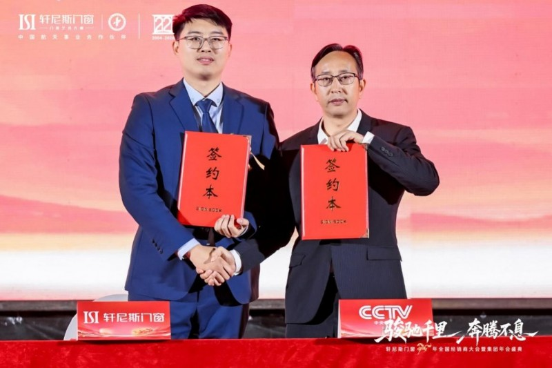 在这场华宴之上,一项标志品牌升维的重磅签约仪式隆重举行。轩尼斯门窗集团副总裁曾繁汇先生与中央广播电视总台签约代表丁庸先生共同签署战略合作协议,标志着品牌建设获得了国家级权威平台的高度认可。此次合作并非偶然,早在2025年,轩尼斯门窗便已多次登陆央视频道,其赞助的“江苏省城市足球联赛”获央视深度报道,品牌影响力持续提升。